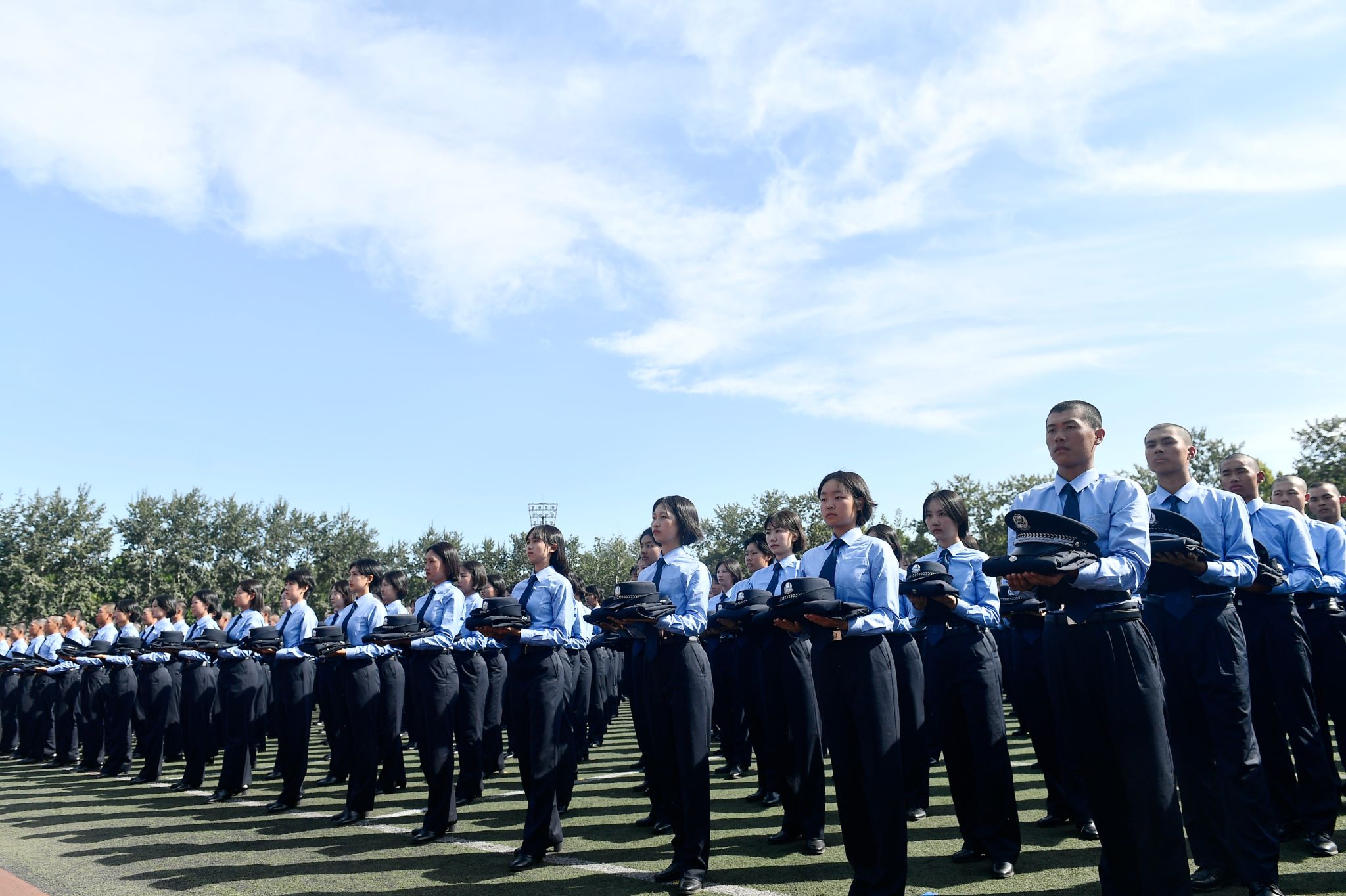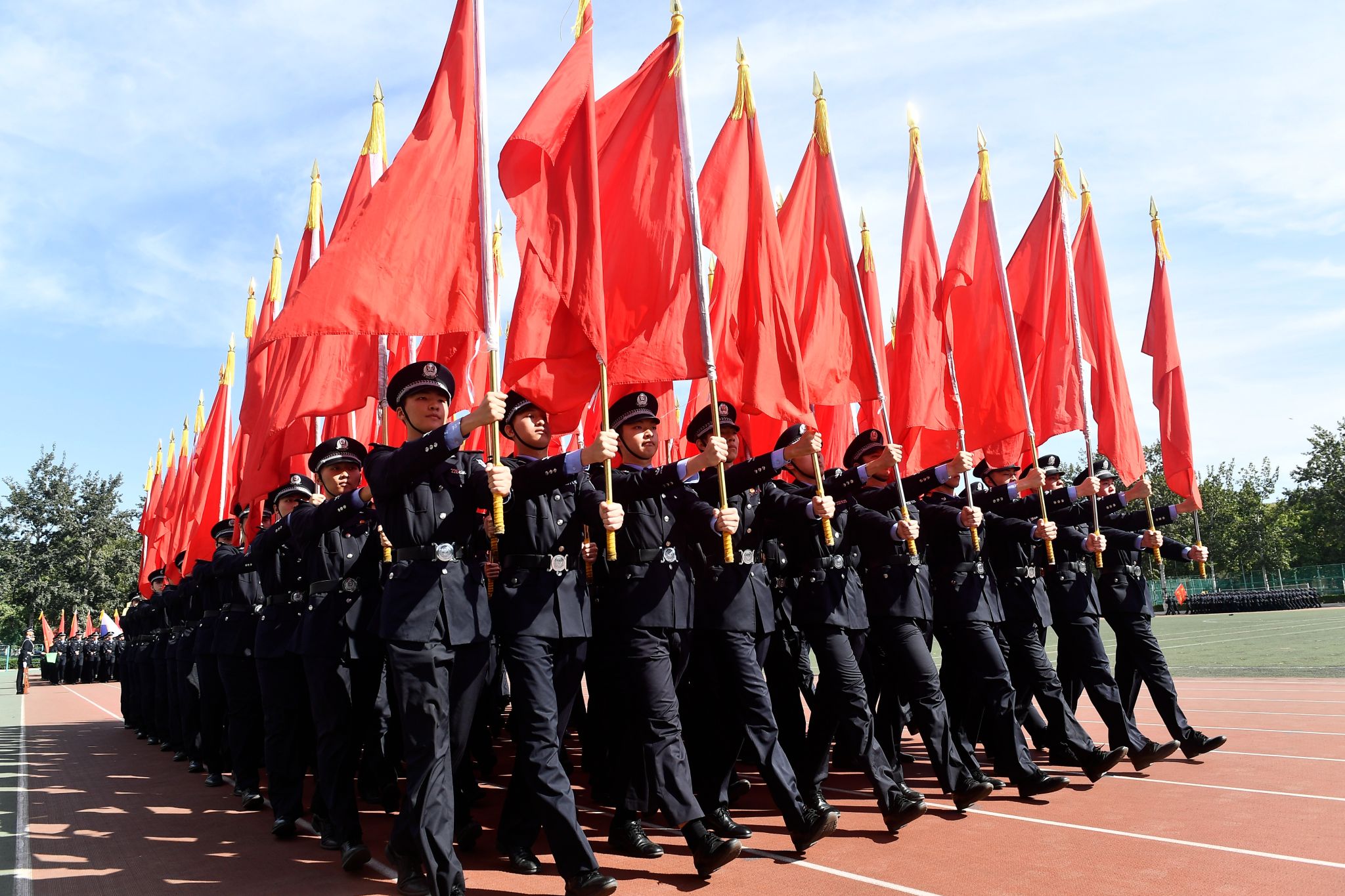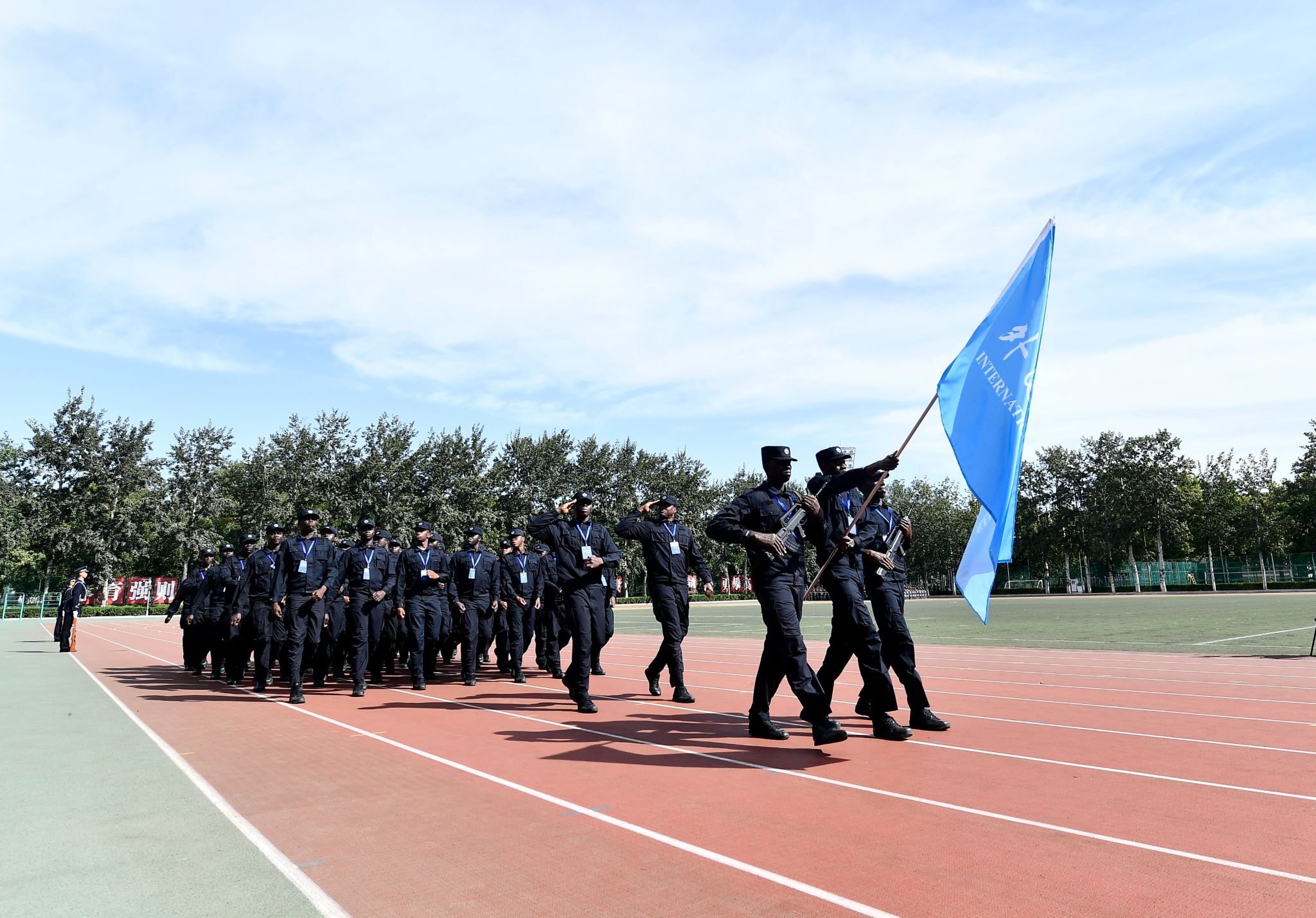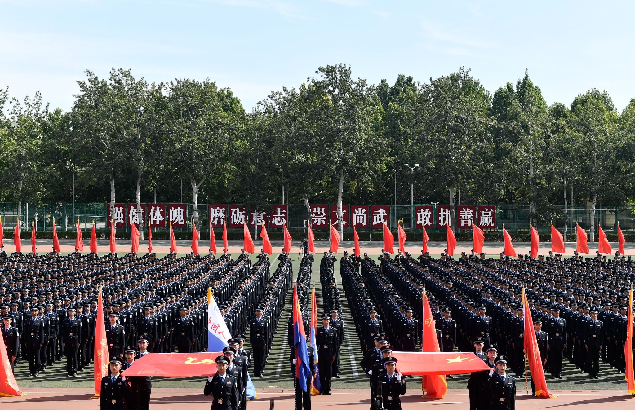 上午10:00,汇报演练在庄严的升国旗仪式中开始。在党旗、国旗方队的引领下,17个方队以斗志昂扬的精神面貌和意气风发的青春姿态依次通过主席台接受检阅。他们用严整威武的警容、雄壮豪迈的步履、激扬嘹亮的口号展现出警务化管理教育训练取得成果,赢得主席台和观礼台上的一阵阵热烈掌声。正在学校接受培训的来自几内亚比绍的学员也专门组成方队参加了演练。