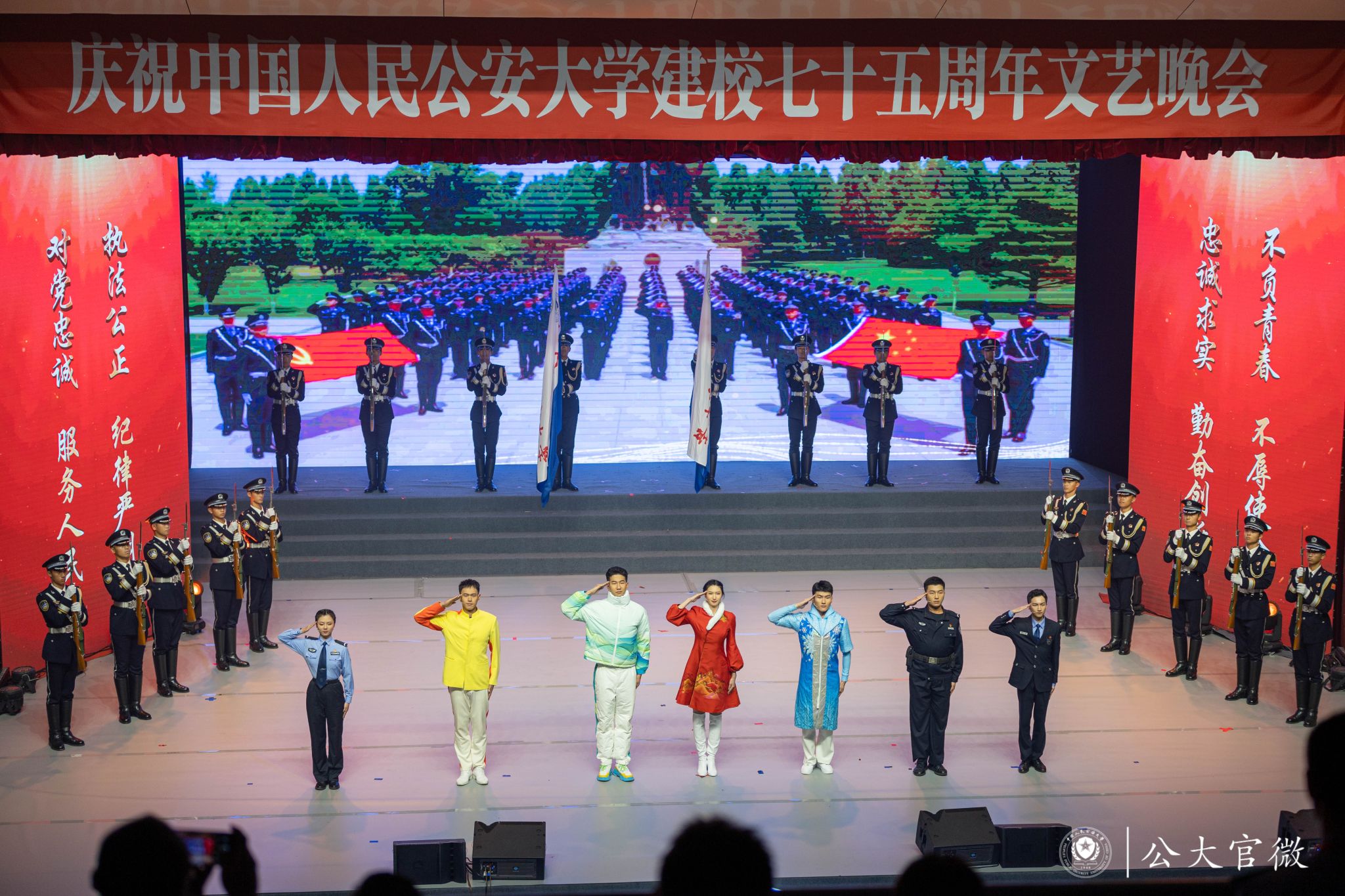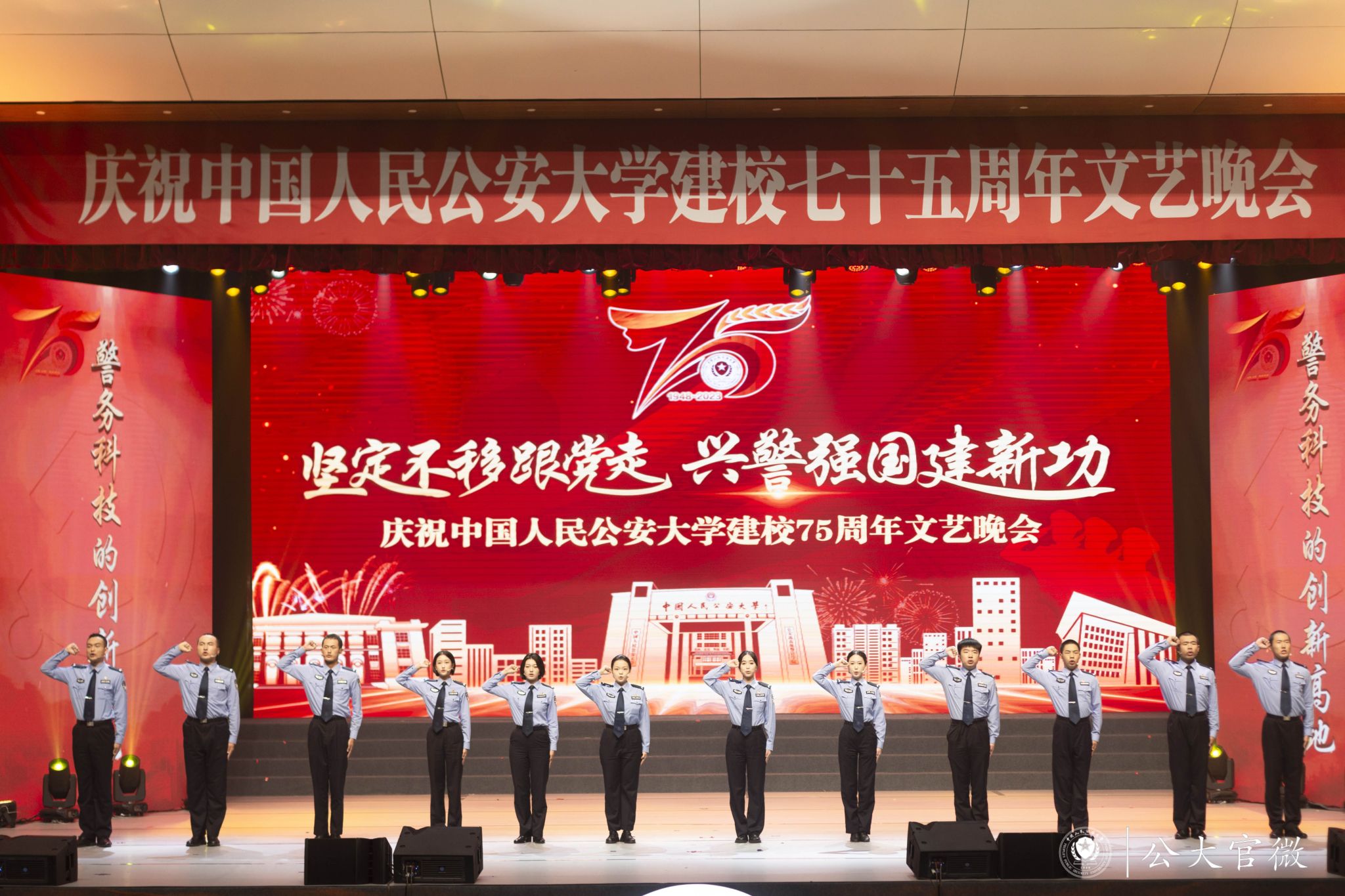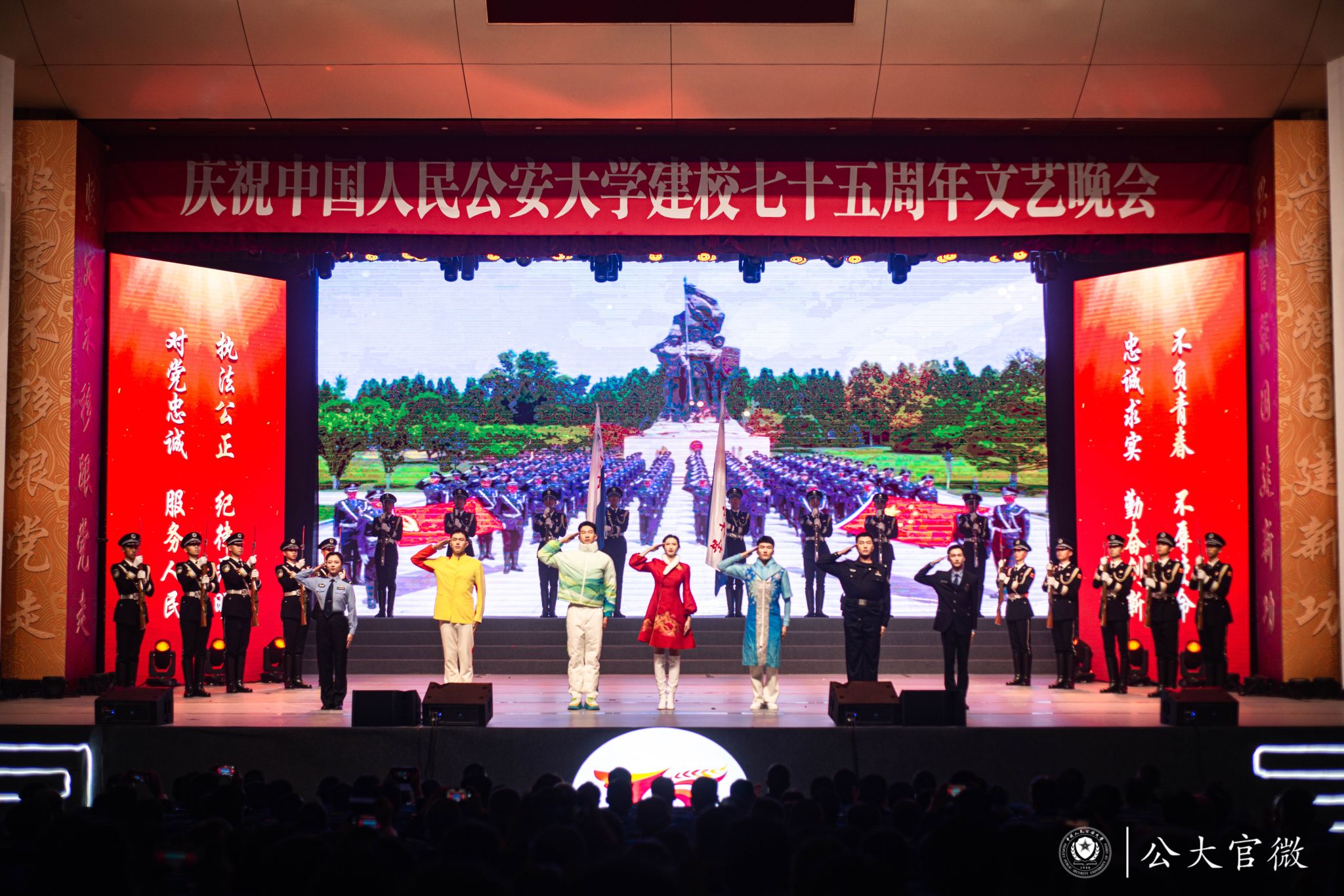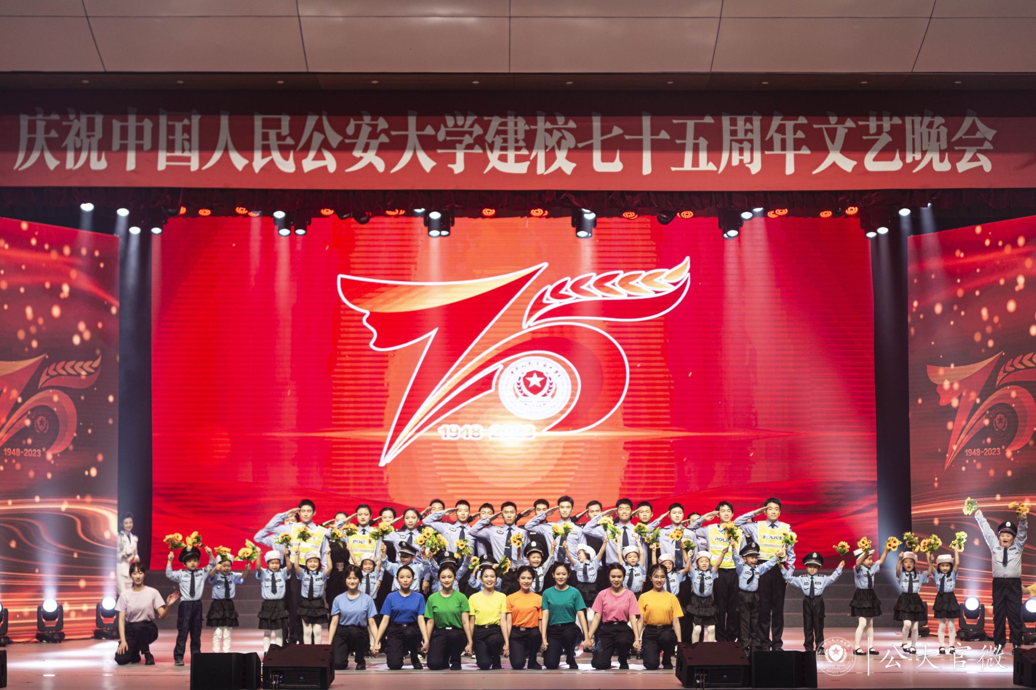 2023年10月12日是学校建校75周年纪念日。当晚,学校在木樨地校区礼堂隆重举办庆祝建校75周年文艺晚会,邀请来自全国32所兄弟公安院校、11个与学校签订合作共建协议的省级公安机关、澳门司法警察学校、学校合作共建和捐赠企业的有关负责人以及英雄模范校友代表、各界友好人士代表等与学校全体校领导和在校师生代表欢聚一堂,共同庆祝公安大学建校75周年。晚会以“坚定不移跟党走·兴警强国建新功”为主题,共分为“为党而生”“育警强国”“续写荣光”三大篇章,围绕着习近平总书记给kaiyun官网在读公安英烈子女回信的殷切嘱托,回顾了学校七十五年创建发展的光辉历程,展现了一代又一代公大人坚定不移听党话、跟党走的忠诚信念。