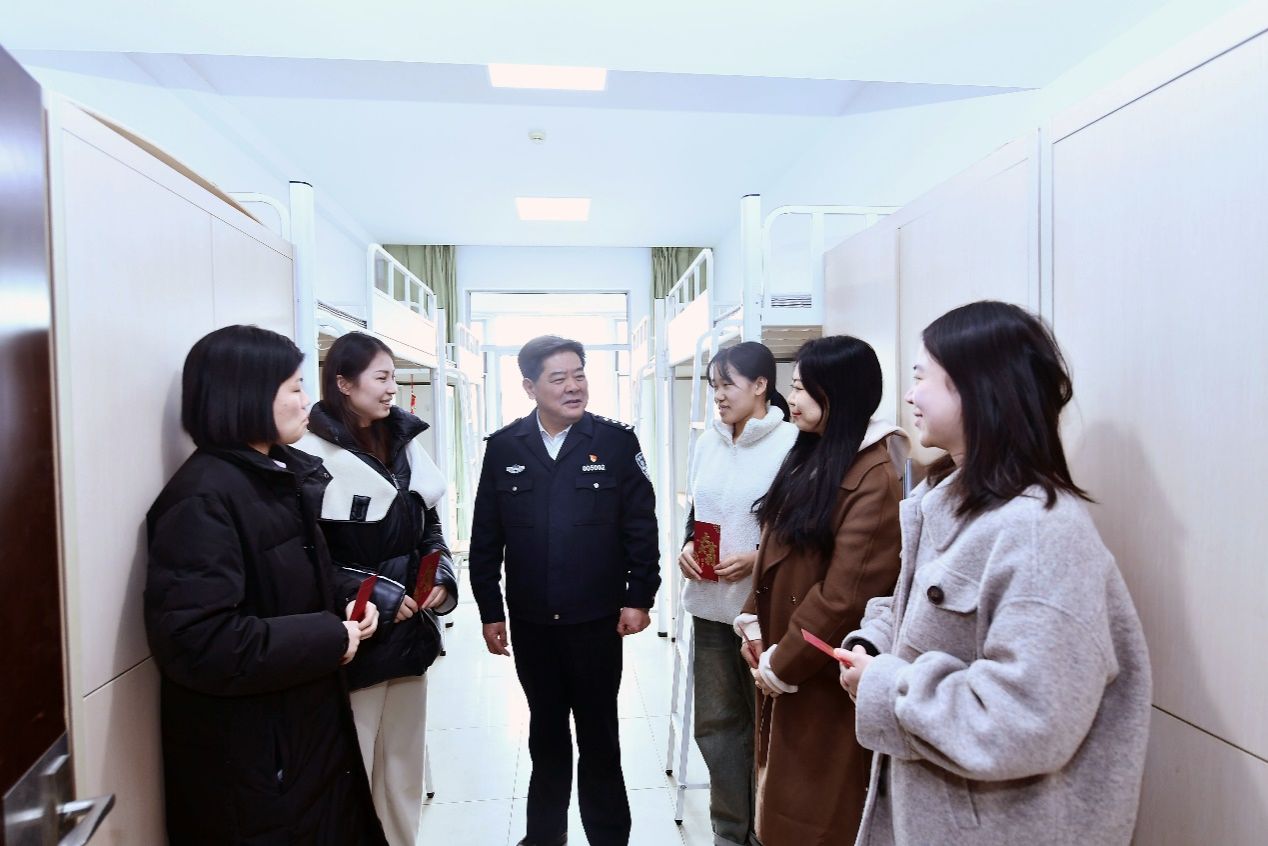 走访中,曹诗权校长与大家亲切交谈,为大家送去新春祝福。曹诗权指出,值班各单位要牢固树立安全底线,坚守工作岗位,特别是要做好水、电、暖、网、食的安全管理,确保校园安全。曹诗权校长对同学们留校学习表示肯定,要求大家严格要求自己,利用宝贵的假期时间认真学习,圆满毕业论文写作等各项学习任务。