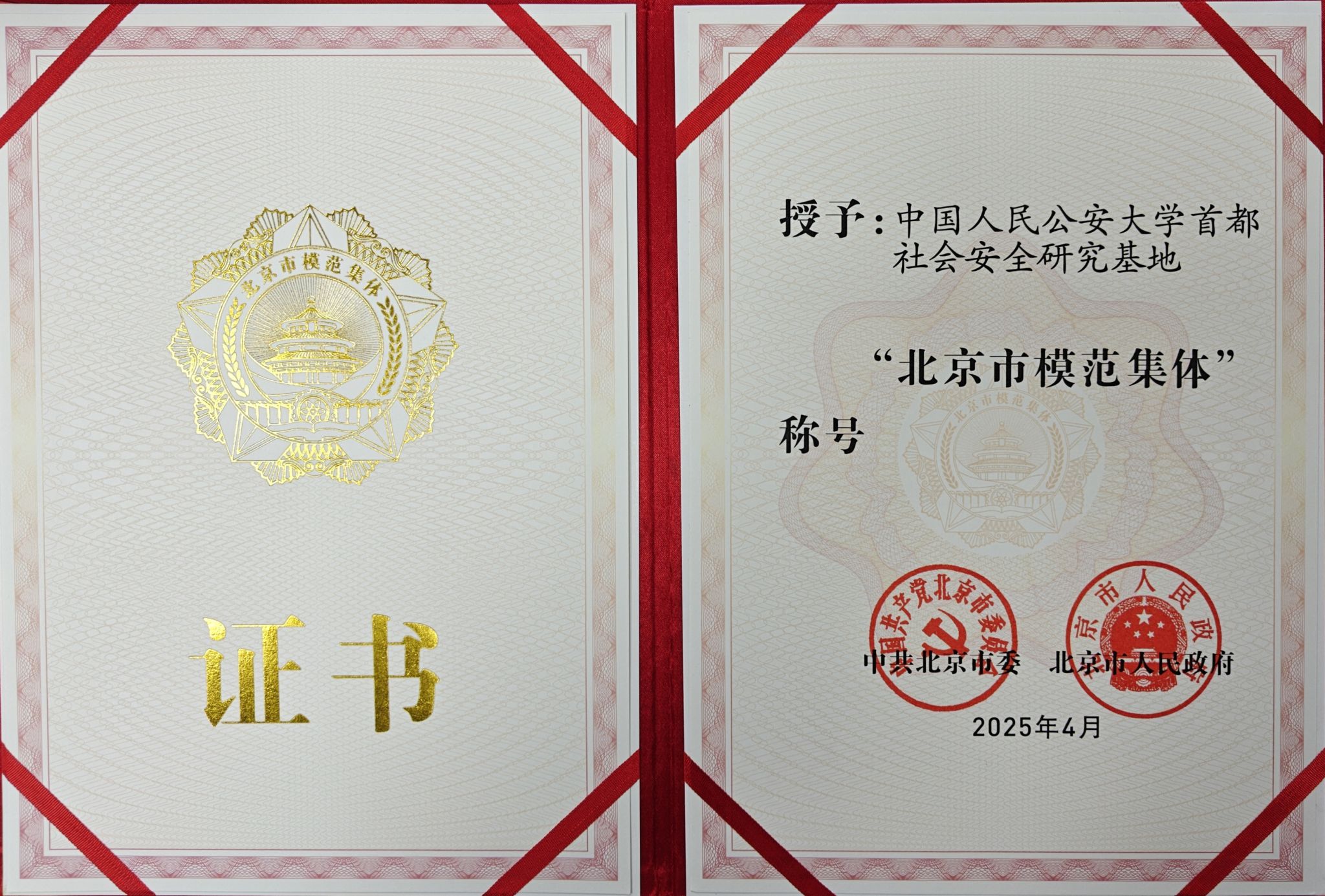北京市模范集体是北京市政府授予在经济社会发展中作出突出贡献的集体荣誉称号,每5年评选一次。此外,研究基地还先后获得公安部直属机关先进青年集体、CTTI(中国智库索引)中国高校智库百强等荣誉。