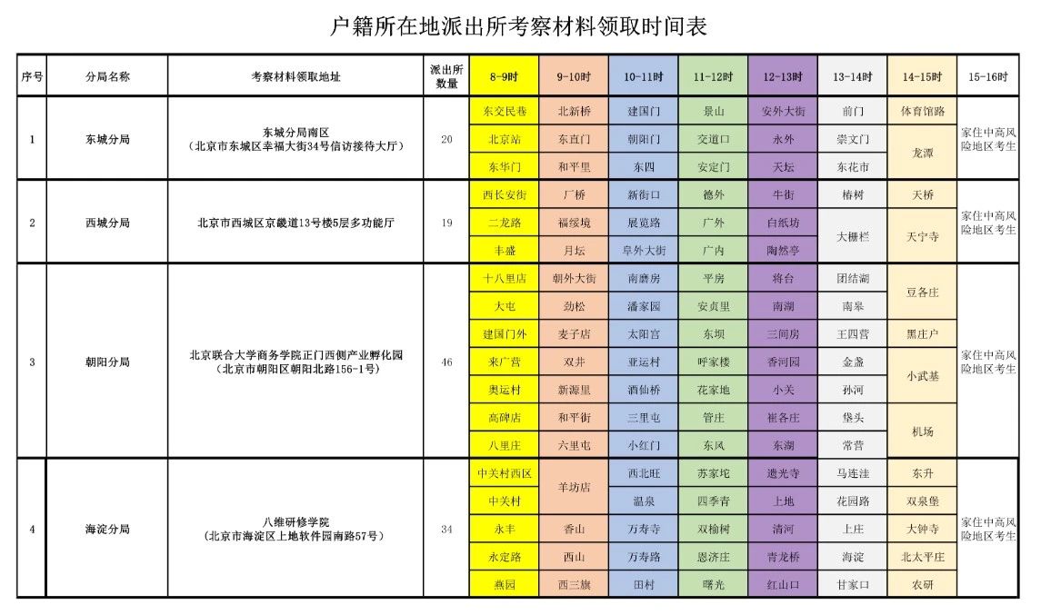 凡报考我校志愿且分数线达到或超过本科控制线的考生,需于7月26日(8时至16时),按照考生户籍所在地派出所指定领取时间,分时段到考生户籍所在地分局指定地点完成考察材料领取、填写、上交等工作。