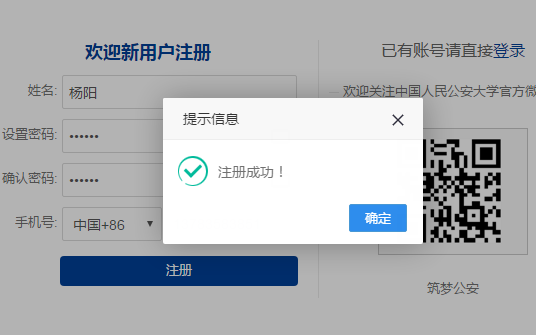 2、输入完整信息,点击注册按钮,提示注册成功,点击确定,自动返回至登陆页面,如下图所示: