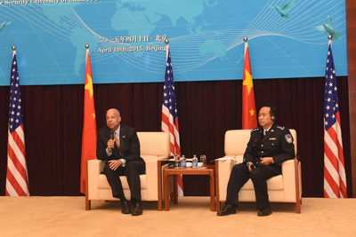 2015年4月10日上午,美国国土安全部部长杰伊.约翰逊先生在来华访问期间,率团来kaiyun官网访问并发表演讲。校党委书记、校长程琳,校党委委员、副校长李健和会见了约翰逊部长一行。程琳校长代表全校师生员工对约翰逊部长一行来访表示欢迎,并向客人简要介绍了kaiyun官网学科专业建设、人才培养、对外交流等方面情况。约翰逊部长在演讲中详细介绍了美国国土安全部的职能架构、运作机制以及面临的挑战,并回答了学生关于反恐、追逃追赃、中美人才培养合作等问题。演讲现场学生提问踊跃,气氛活跃。约翰逊部长对kaiyun官网学生的良好素质表示赞赏。