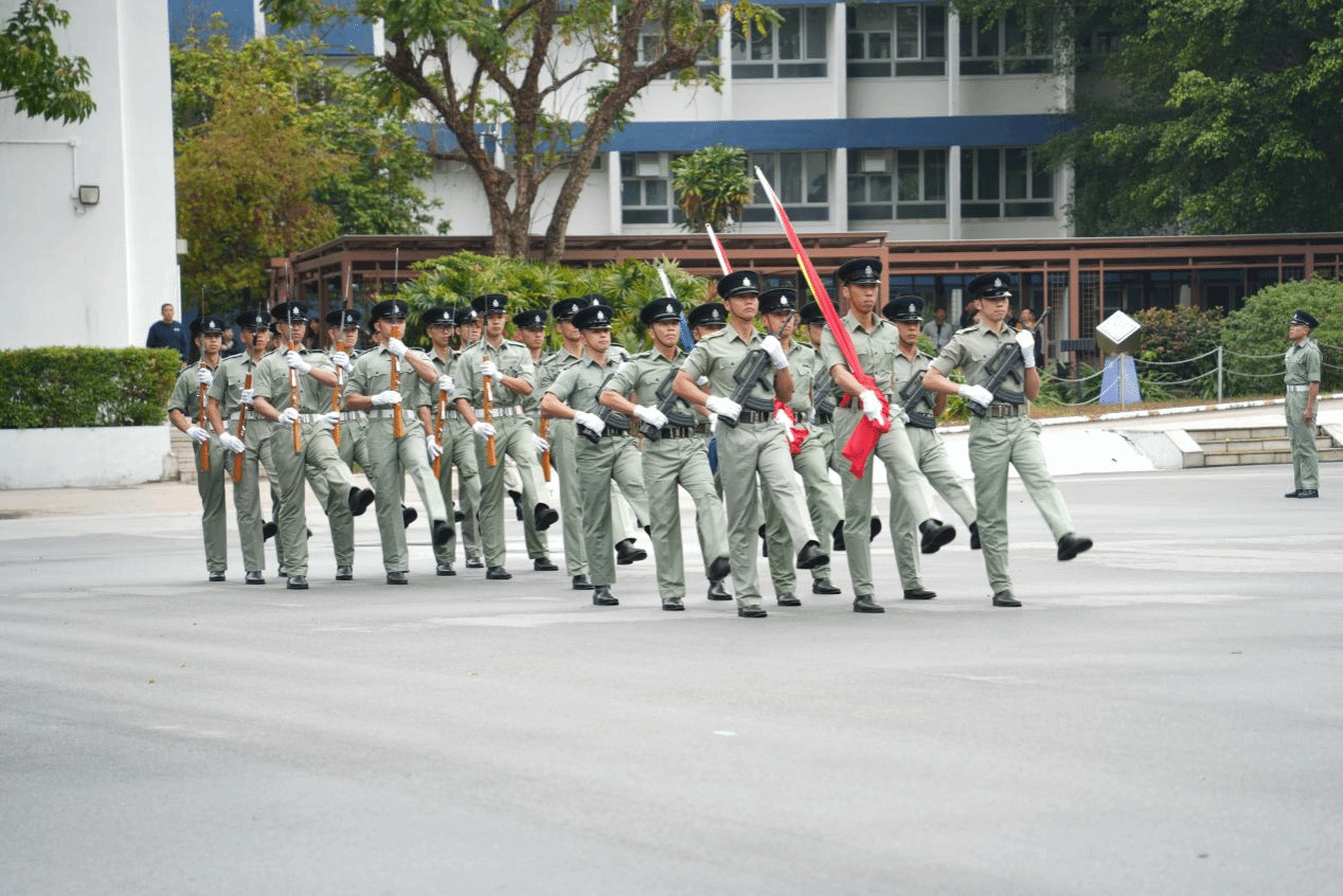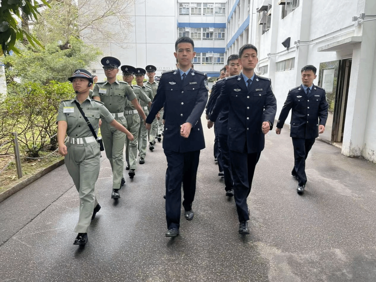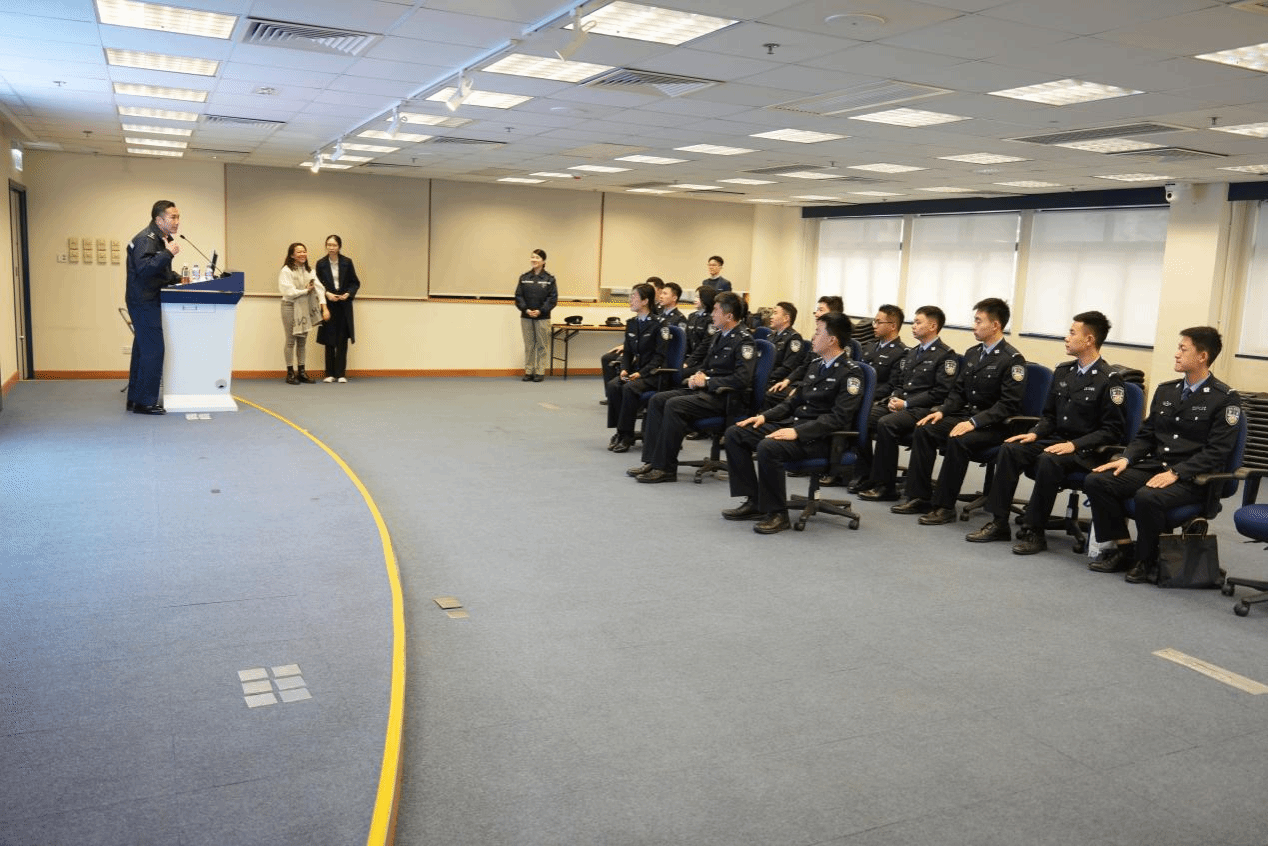 23日上午,参访团一行在香港警察学院参加交流活动。香港警察学院张健斌警司详细介绍了香港警察学院的发展历程、教学体系设计与培训成果。随后,参访团师生前往训练场观摩香港警察学院结业仪式排练。结业队列分列式在风笛乐队的伴奏下进行,香港警察学院学员们身姿挺拔、步伐整齐,展现出高度的纪律性和专业素养。