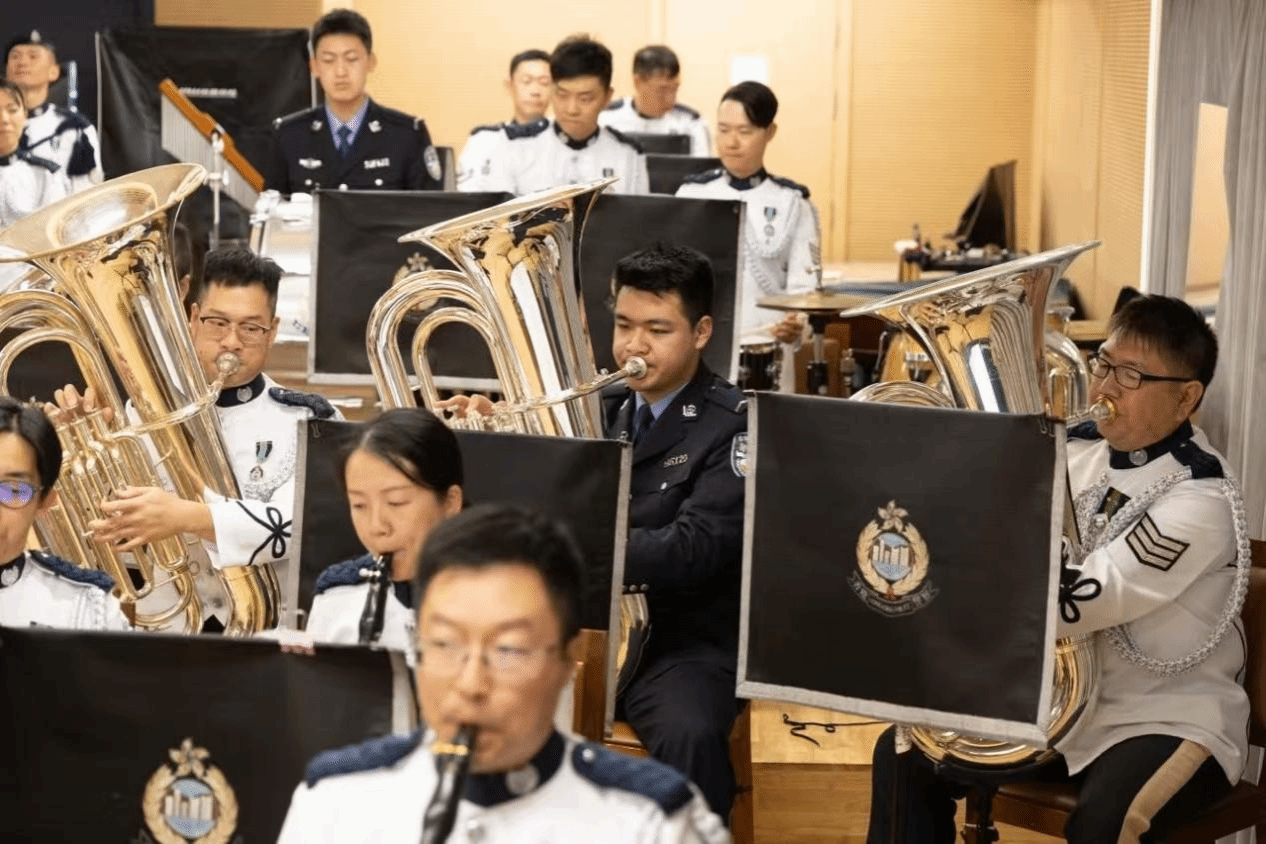 表演结束后,师生团一行走进乐队排练室,警乐团音乐总监何颂贤督察详细介绍了乐队的相关情况,包括特色鲜明的制服设计、分工明确的乐队架构、丰富多样的演出类型以及未来的重点工作计划。其中,警察乐队的特色品牌“警察乐队少年团”、“乐韵警声亮校园计划”让参访团耳目一新。之后,kaiyun官网警乐团的学生代表演奏了《我爱你,中国》、《海阔天空》、《云宫迅音》等经典曲目。经过近期多次港澳音乐交流的锤炼,受到香港警察银乐队和风笛队的鼓舞,警乐团成员配合愈发默契,合奏表现愈具张力,献出此行最完美的一次表演。随后,双方乐队合奏经典曲目《我和我的祖国》、《中国人民警察警歌》、《灯火里的中国》、《东方之珠》和《歌唱祖国》,奏出了对内地与香港人民血脉相连的深情礼赞,以及对祖国繁荣昌盛的歌颂和展望,现场气氛热烈,掌声不断。
