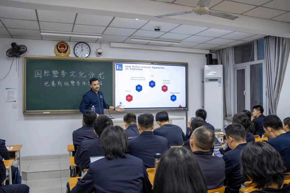萨吉卜副督察拥有法学与工商管理学双学士学位,曾获伊斯兰堡警察反恐比赛一等奖,具有丰富的反恐实战经验。他以“体系化、实战化、国际化”为脉络,系统解读了巴基斯坦警务体系的三级架构与职能分工,介绍了巴基斯坦接处警标准化流程。互动环节中,师生围绕巴基斯坦执法文化差异对跨国执法的影响等议题踊跃提问,萨吉卜副督察结合国际警务合作框架、边境联合执法鲜活案例,认真回答了大家的问题,引发现场热烈讨论。