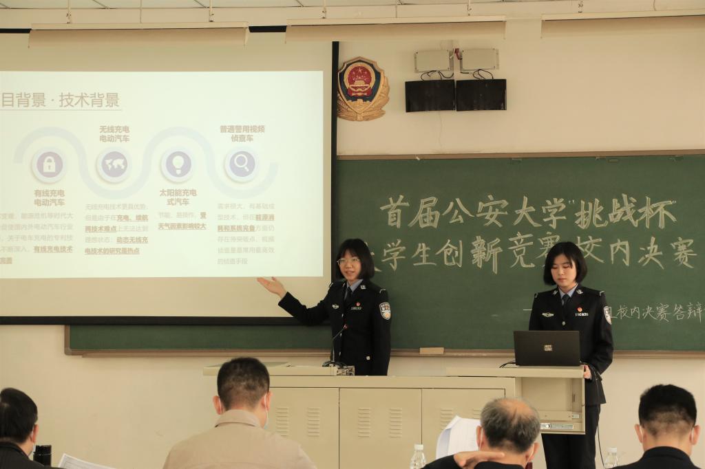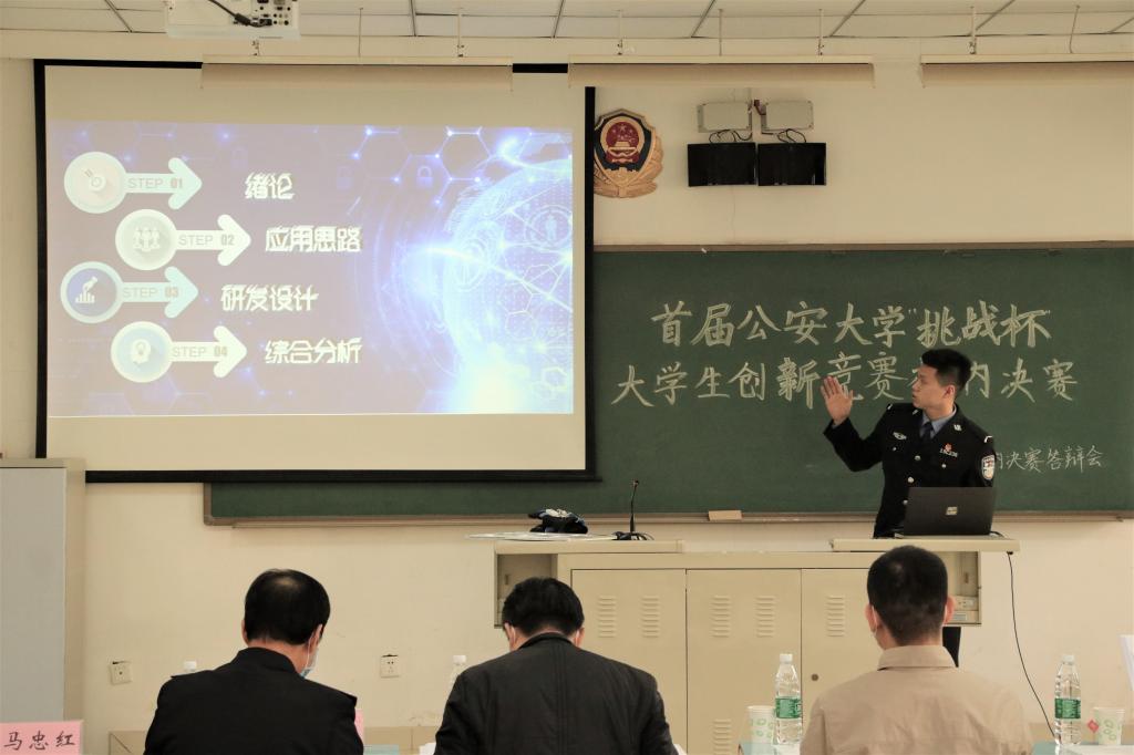 为深入学习宣传习近平新时代中国特色社会主义思想,全面贯彻落实党的十九届五中全会精神,全国公安工作会议精神和全国教育大会精神,贯彻落实校党委“三严一看齐”准军事化建设标准,建设“双一流”学科高校,积极备战第十一届“挑战杯”首都大学生课外学术科技作品竞赛,选拔优秀项目,为学校争得荣誉,校团委于3月24日下午在团河校区铸剑楼101、102举办了首届公安大学“挑战杯”大学生创新竞赛决赛。