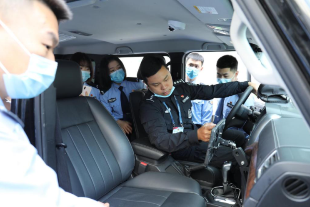 北京市公安局西城分局是维护首都核心区域安全的主要力量,分局民警齐心协力用实际行动做党和人民绝对信任的“红墙卫士”。政治中心区一体化战训队是一支集警务化、现代化、信息化为一体的队伍,在首都政治中心区域承担重要安全防控任务。同学们参观并了解了他们日常使用的特种车辆及其安装的人脸识别警力信息化系统、无死角探头和5G传输等技术,几位民警分别给同学们依次介绍并展示了特种车上配备的防护、抓捕、处突等六大类一线使用的新式前沿武器装备,同学们也学习并体验了一些装备的具体使用方法。紧接着,同学们参观了战训队建立以来的成果展览,学习了他们“七个坚持”、“三队五岗”、“科技赋能”等创新性思想。