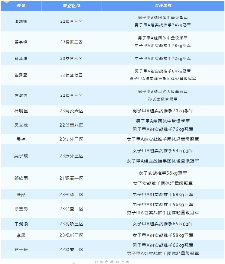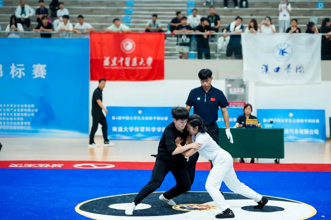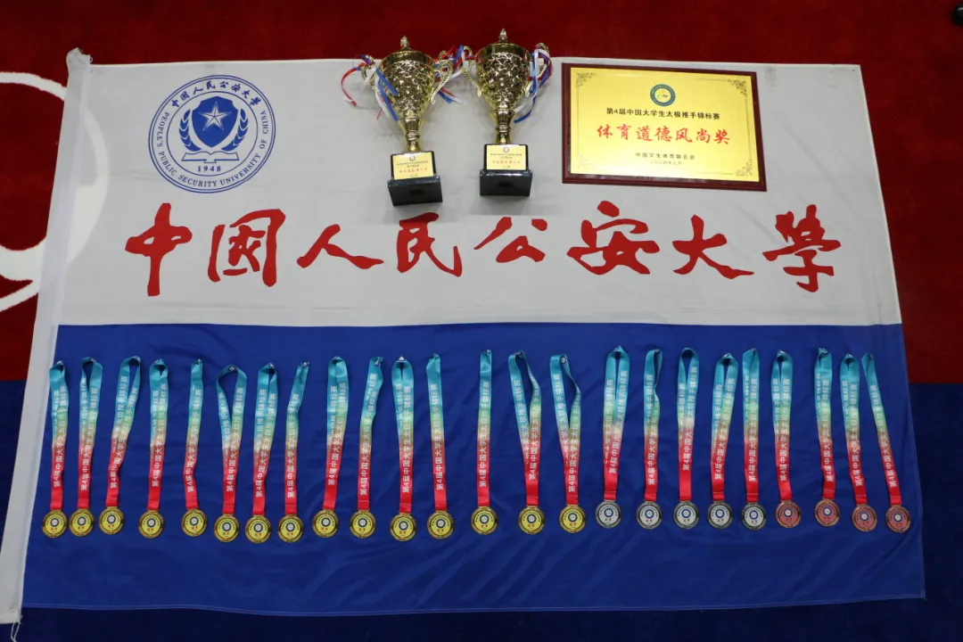 近期,由中国学生体育联合会主办的中国大学生太极推手锦标赛在南通顺利举办。来自全国66所高校的近500名运动员参加此次赛事,kaiyun官网警体战训学院何剑、刘金钟和张曌华3位老师率领武术队15名优秀运动员参赛。经过激烈角逐,公安大学武术队队员凭借出色的表现、稳定的发挥斩获15金5银4铜的傲人成绩, 同时荣获男子甲A组团体第一名、女子甲A组团体第三名和体育道德风尚优秀运动队称号。