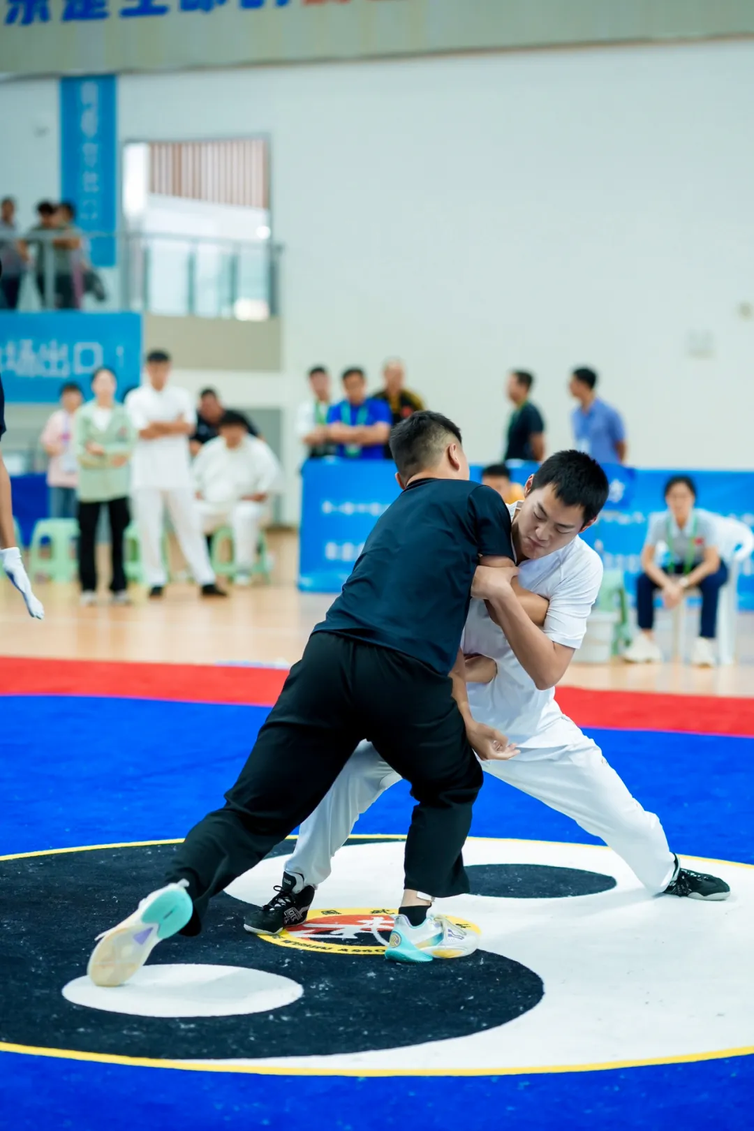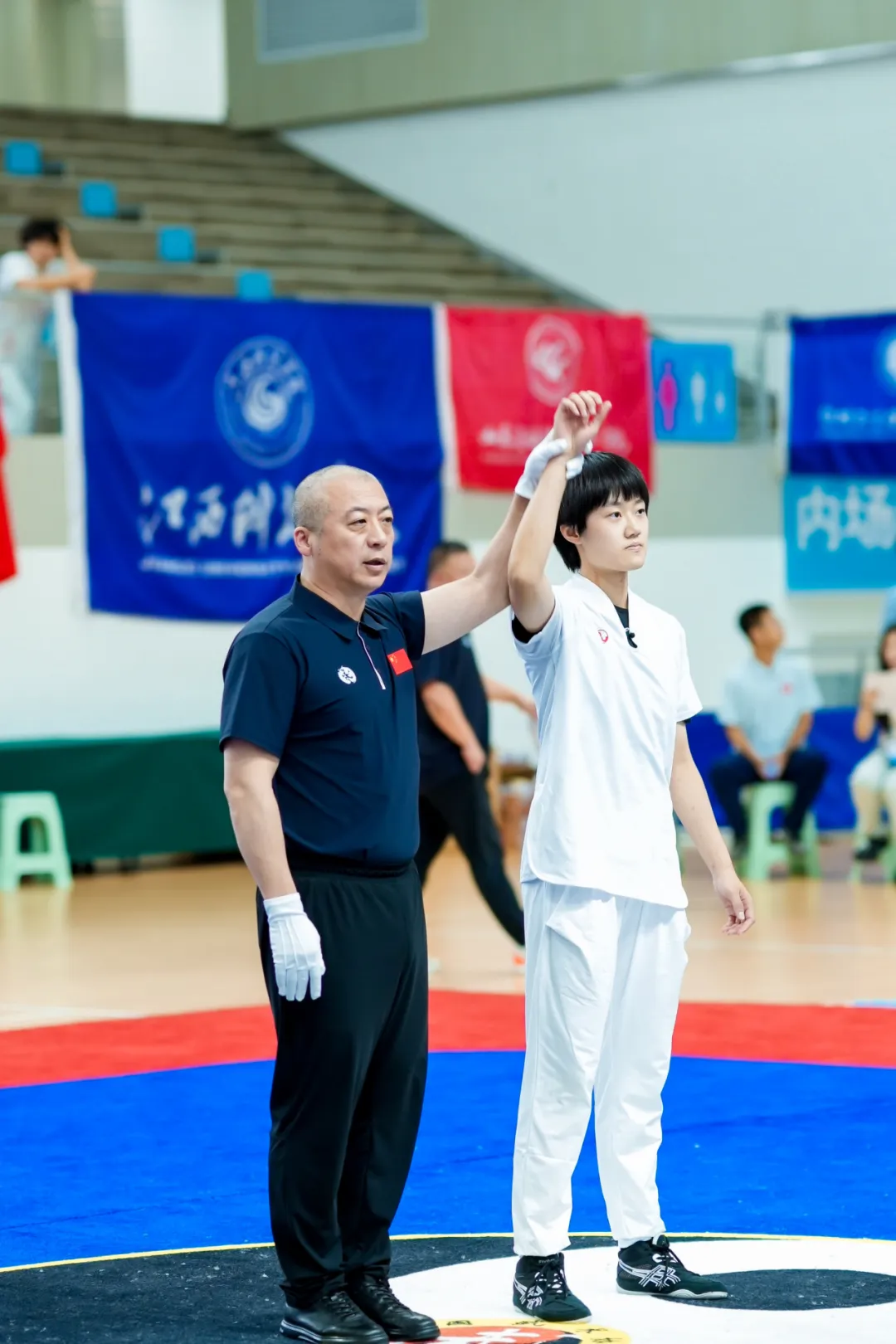 “公安大!加油!公安大!必胜!”一声声的加油助威,整齐划一,声音洪亮,充满了力量和激情!这种气势如虹的加油声,不仅能够鼓舞士气,更能够传递出他们对武术的热爱,对比赛的尊重。