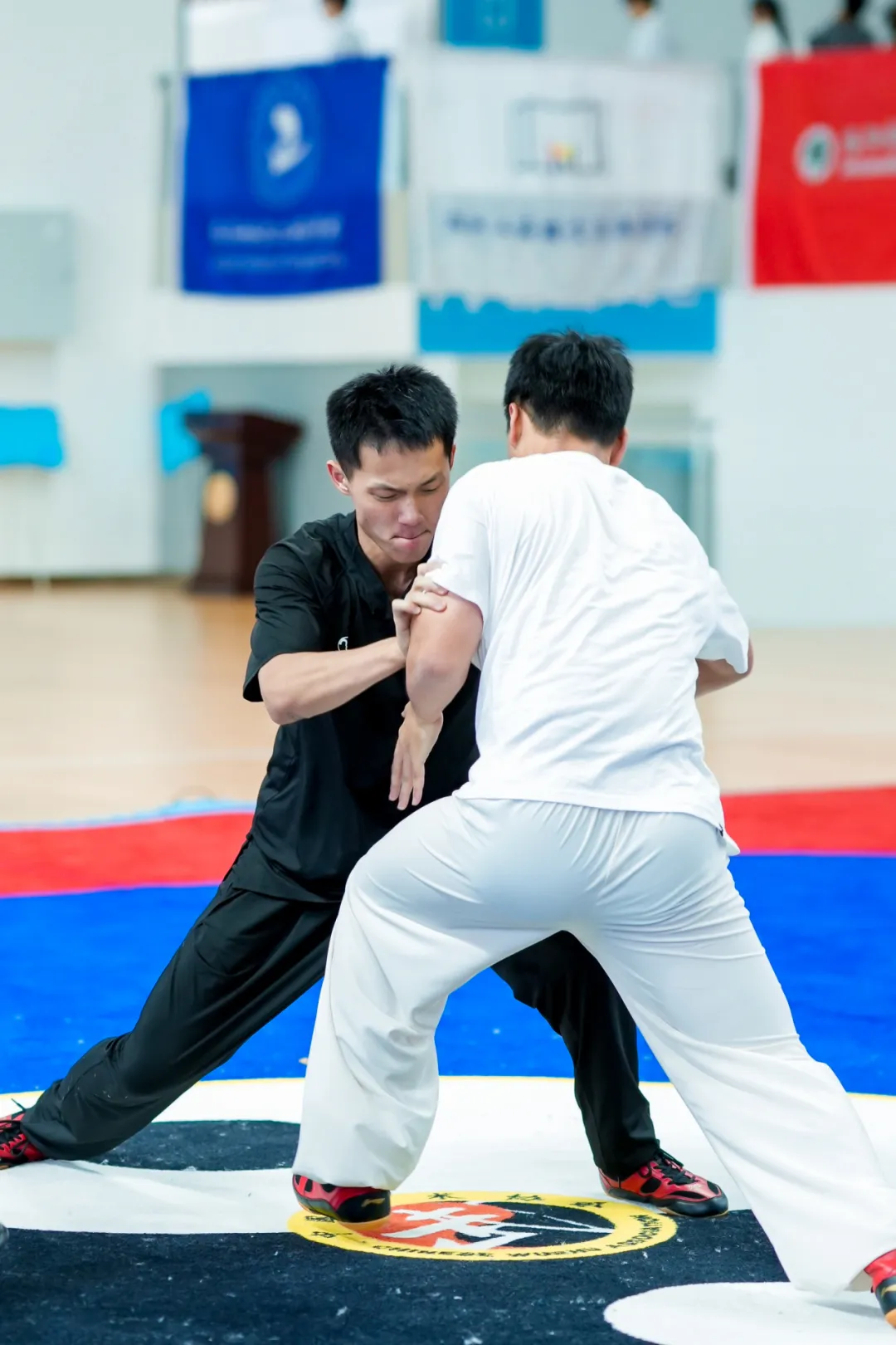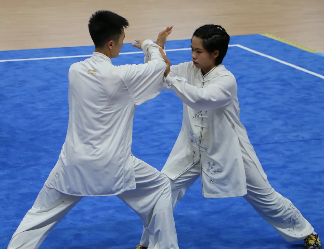 在备赛过程中,三位老师通过不同的训练方式给队员传授了丰富的实战知识和比赛技巧,充分体现了太极推手以柔克刚、动静结合、四两拨千斤的技术特征。以上肢、躯干为攻击部位,保持双腿重心的平衡稳定,太极推手充分运用“掤、捋、挤、按、采、挒、肘、靠”等技法以达到借力、发力的目的,使对方身体失去平衡性。队员通过日复一日的训练,熟练掌握了双按掌、玉女穿梭、野马分鬃等多种有效的进攻技巧,同时针对各种特殊动作的响应处理方式和破解方法做了专项训练。