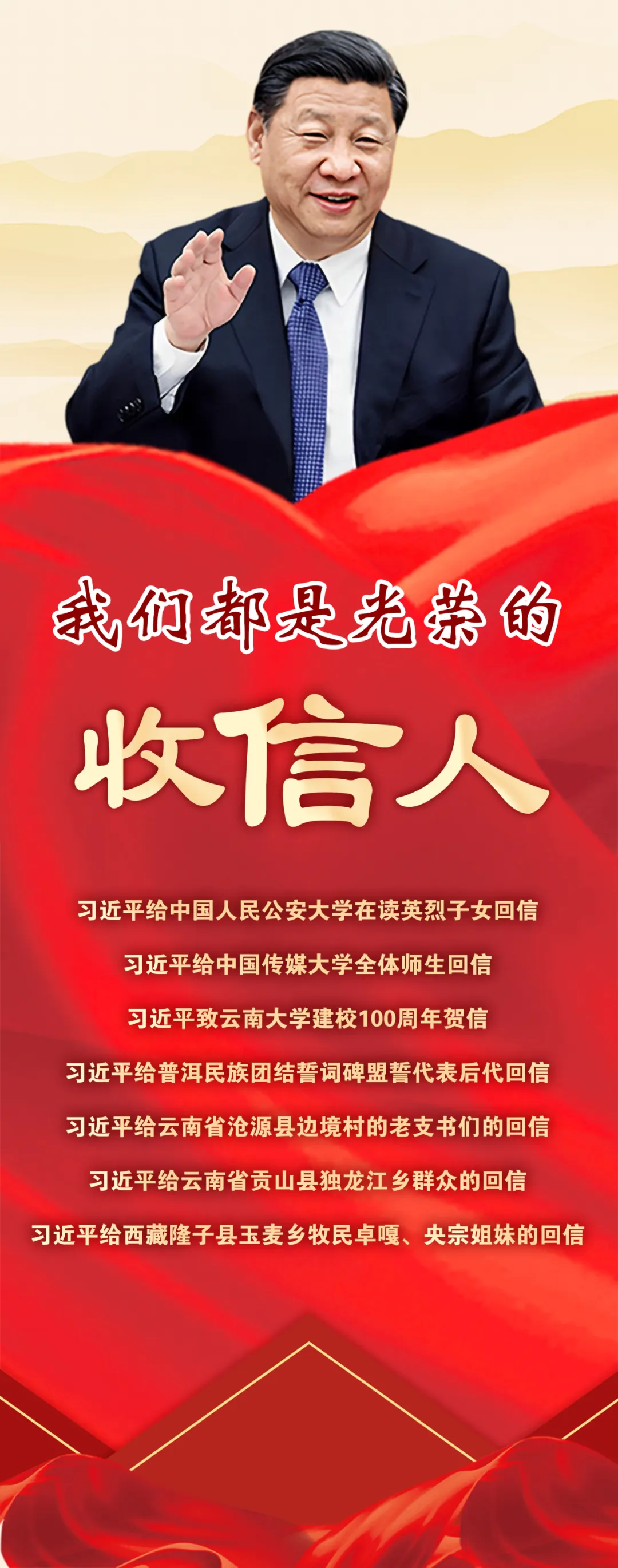 信中,习近平总书记高度评价玉麦乡牧民坚守祖国边陲,传承爱国守边精神;充分肯定独龙江乡脱贫奔小康,书写新时代的奋斗篇章;热烈赞扬沧源边境村老支书们带领乡亲脱贫攻坚,巩固边疆稳定与繁荣;鼓励云南大学继续扎根云岭大地,为民族团结与区域发展贡献力量;勉励公安大学英烈子女承袭父辈遗志,坚定理想信念做党和人民的忠诚卫士。