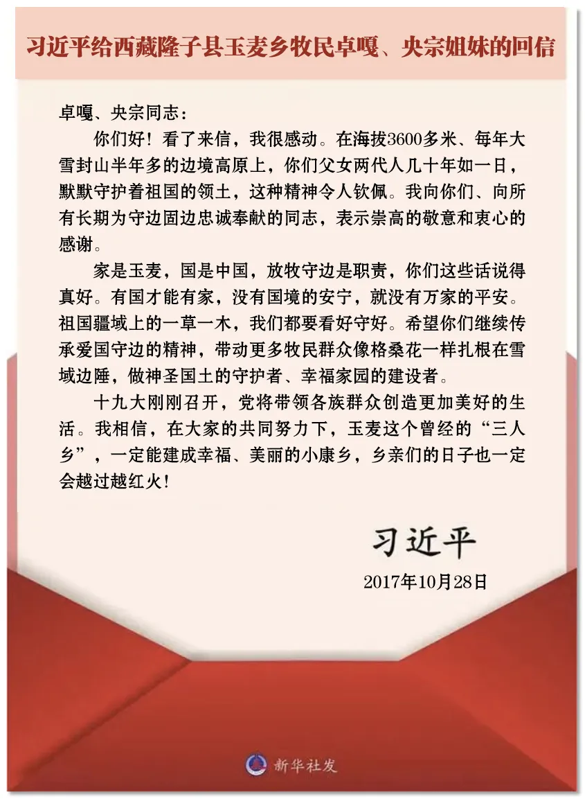 习近平给西藏隆子县玉麦乡牧民卓嘎、央宗姐妹的回信