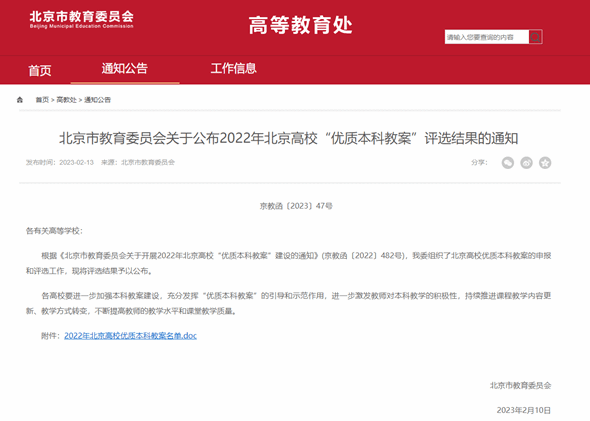 2022年11月,北京市教委组织开展2022年北京高校“优质本科教案”项目的申报和评选工作,是该项目的首次评选,经北京地区各高校自主申报、市教委审定并公示后,最终遴选出172项面向全日制本科生的教案和28项面向继续教育的教案。