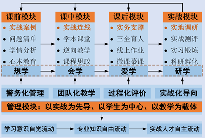 教案设计注重“教、学、研、产”一体化培养方式创新。课程立足“学本课堂”教学模式,通过逆向教学、翻转课堂、混合教学的教法创新,让学生更加了解自身对专业的真实需求,注重自我业务能力和专业素养的提升;并且也推动教学走出教室、走出学校、走进实战,让学生在与实战部门对接、锻炼的过程中“以练代学”“以学促研”,形成知识性产出,同时也促使教师在教育改革中实现“教研一体”“教产融合”。