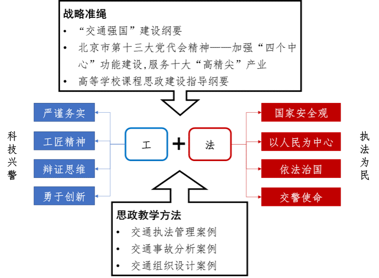 教案设计以 “交通强国”战略、党的一系列会议精神、教育部文件指示,以及北京市第十三次党代会精神为指引,以案例教学为基础,设计了充分体现公安交通管理工程专业“工法结合”特色的课程思政教学模式。