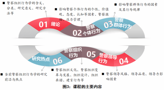 《警察组织行为学》是运用心理学、管理学、社会学、社会心理学等相关学科的知识,通过研究警察心理和行为的特征与规律性,提升警察个体与警察组织行为效率的公安管理专业课程。该课程注重从警察组织中个体、群体以及组织三个层次水平分析影响警察个体行为表现以及警察组织绩效的相关影响因素,以实证研究作为基础,解释警察个体、群体、组织的行为规律以及相关影响因素的作用机理。警察组织行为学课程对于学生专业知识能力要求较高,可以有效提升学生对于中外警察学前沿文献的掌握程度,了解公安管理学科科学研究的基础模块,是提升学生研究能力的基础核心课程,是本研一体化建设的主要课程依托,是课程建设与科研工作贴近实战、服务实战的重要抓手。