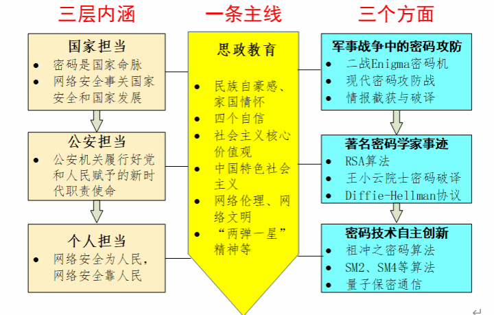 加强教案的课程思政建设,融入国家安全和公安使命等元素。构建了“三层内涵、一条主线、三个内容”的课程思政教学体系,将课程内容分解为三个方面:军事战争中的密码攻防、著名密码学家事迹、密码技术自主创新,在国家担当、公安担当、个人担当三层内容设计和规划中,始终贯穿“思政教育”这一主线,形成新的教学大纲,完善教案体系建设,实现思想政治教育与知识体系教育的有机统一。