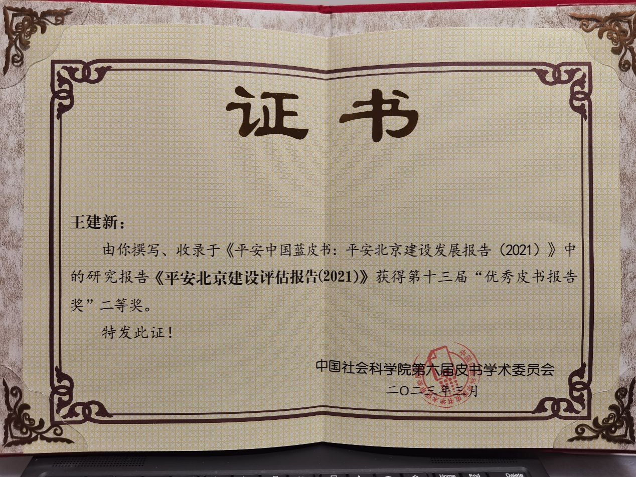 会议公布了第十三届“优秀皮书奖”和“优秀皮书报告奖”评选结果。本届“优秀皮书报告奖”经主编推荐、编辑推荐、作者申报,共计815篇报告符合优秀皮书报告奖评选要求,经过初评、复评和终评,共计63篇获奖。其中,kaiyun官网王建新副教授撰写的《平安北京建设评估总报告2021》获得 “优秀皮书报告奖”二等奖。该获奖报告收录于《平安中国蓝皮书:平安北京建设发展报告(2021)》中,是kaiyun官网首都社会安全研究基地长期关注研究首都社会安全问题,服务首都“四个中心”建设的积极成果,主要通过调查评估方式为更高水平的平安北京建设建言献策。