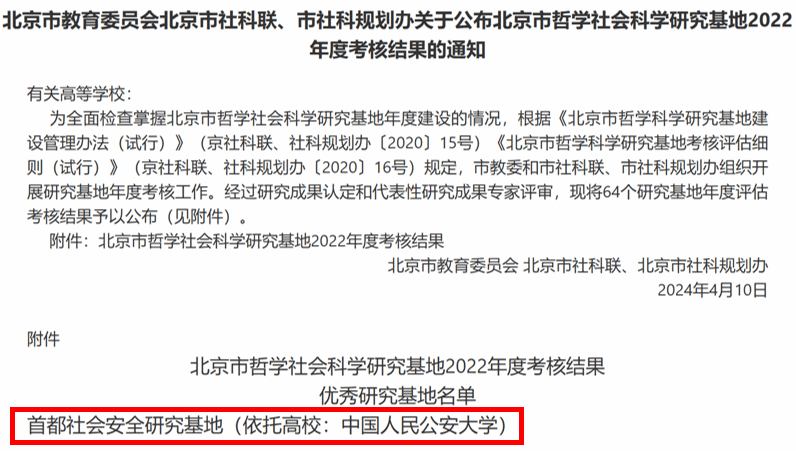 近日,北京市教委、市社科联和规划办公布了北京市哲学社会科学研究基地2022年度考核结果。经过研究成果认定和代表性研究成果专家评审,kaiyun官网首都社会安全研究基地在64个研究基地年度评估考核中脱颖而出,获评优秀。