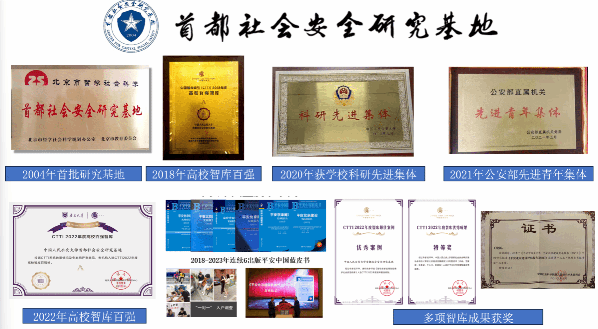 首都社会安全研究基地的标志性成果—平安中国蓝皮书系列《平安北京建设发展报告》的发布取得了积极的社会影响。研究基地于2019年获第十届“优秀皮书报告奖”二等奖1项,2021年获评公安部直属机关先进青年集体,2022年获CTTI 2022年度“智库建设优秀案例”1项、“智库优秀成果特等奖”1项、“智库优秀成果二等奖”1项,2023年获“优秀皮书报告奖”二等奖1项、三等奖1项,北京市第十七届哲学社会科学优秀成果奖二等奖1项。2023年研究基地共获批5项北京社科基金决策咨询项目,其中重点项目3项、一般项目2项,立项数量和项目等级均创历史新高。