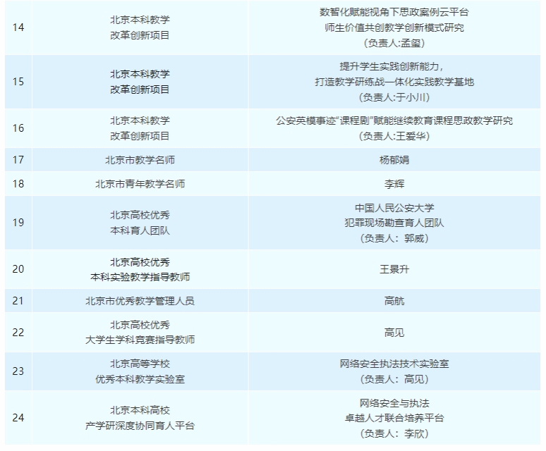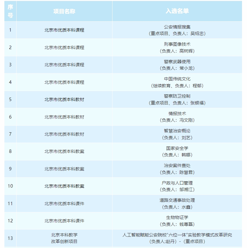 近年来,学校以习近平新时代中国特色社会主义思想为指导,深入学习贯彻习近平总书记关于国家安全、公安工作、教育、科技、人才等系列重要论述精神,贯彻落实公安部、教育部、北京市有关部署要求,坚持立德树人,以“双一流”建设为牵引,以提高教育教学质量为出发点,深化教育教学改革和创新,探索多样化人才成长路径,在课程内涵建设、教学研究和创新、教材建设、师资队伍建设等方面不断取得新成果。下一步,学校将深入学习贯彻党的二十届三中全会精神和习近平总书记在全国教育大会上的重要讲话精神,推动教育教学高质量发展,培养德智体美劳全面发展的创新型、复合型、应用型高素质公安人才,当好全国公安院校的“排头兵”、公安高等教育高质量发展的“排头兵”。