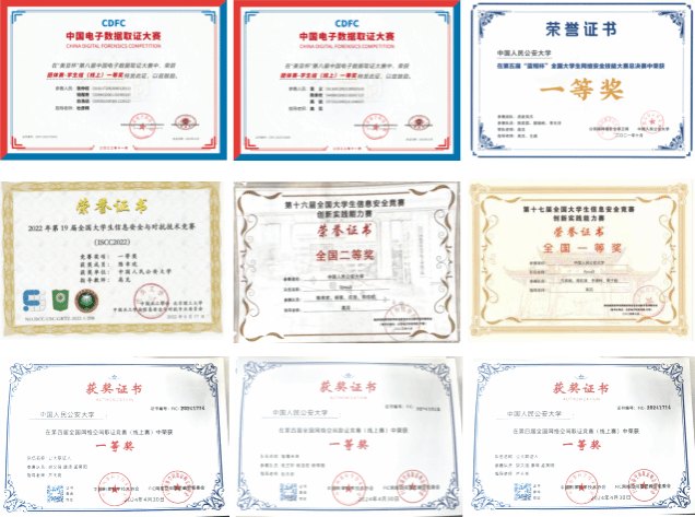 实验室老师们长期带领学生参加网络安全相关竞赛,学生在全国网络全竞赛中多次获奖。近三年获得国家级奖项60余项,其中包括“蓝帽杯”全国大学生网络安全技能大赛第一名、全国大学生信息安全与对抗技术竞赛一等奖、蓝桥杯全国软件和信息技术专业人才大赛网络安全一等奖、全国大学生大数据竞赛全国一等奖、网络安全创新大赛一等奖、京津冀“网安杯”网络安全挑战赛二等奖、全国大学生信息安全竞赛一等奖等。